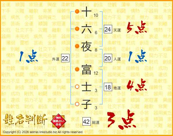 あなたの人生を表す1番重要な運勢です。生涯を通じて影響する総合運となり、主に50歳以降の晩年期に影響を及ぼします。苗字と名前の合計画数。