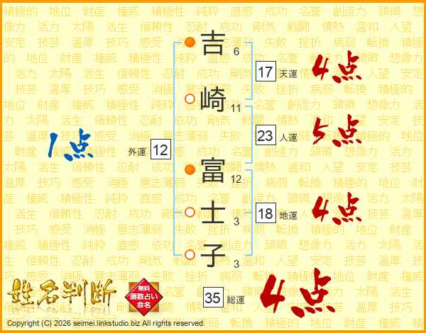 吉(6画)崎(11画) 富(12画)士(3画)子(3画)