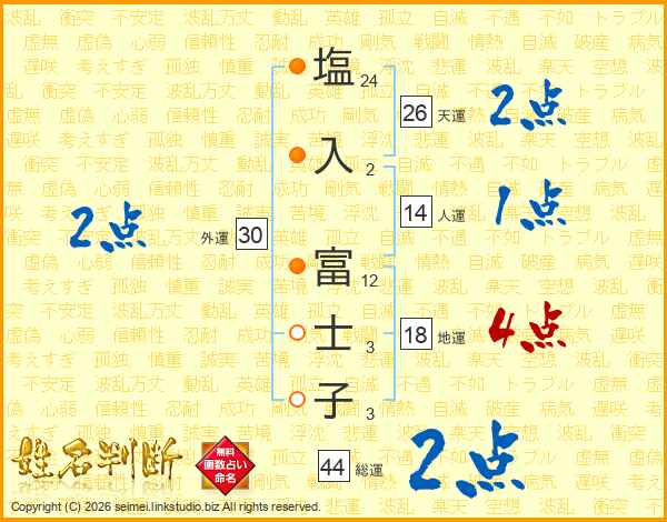 塩(24画)入(2画) 富(12画)士(3画)子(3画)