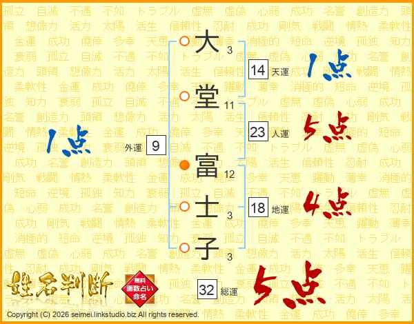 大(3画)堂(11画) 富(12画)士(3画)子(3画)