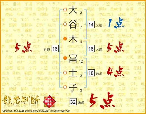 大(3画)谷(7画)木(4画) 富(12画)士(3画)子(3画)