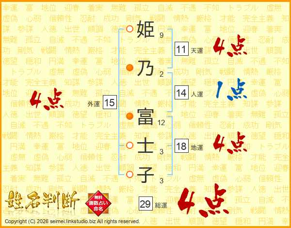 姫(9画)乃(2画) 富(12画)士(3画)子(3画)