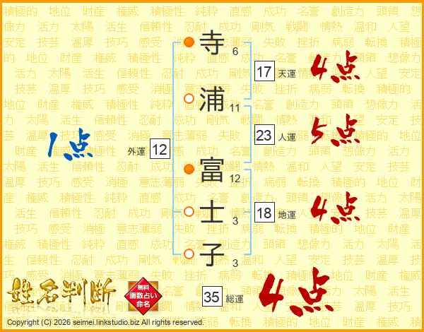 寺(6画)浦(11画) 富(12画)士(3画)子(3画)