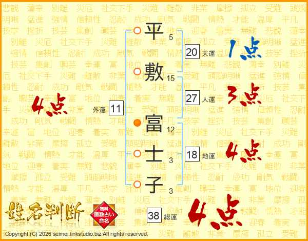 平(5画)敷(15画) 富(12画)士(3画)子(3画)