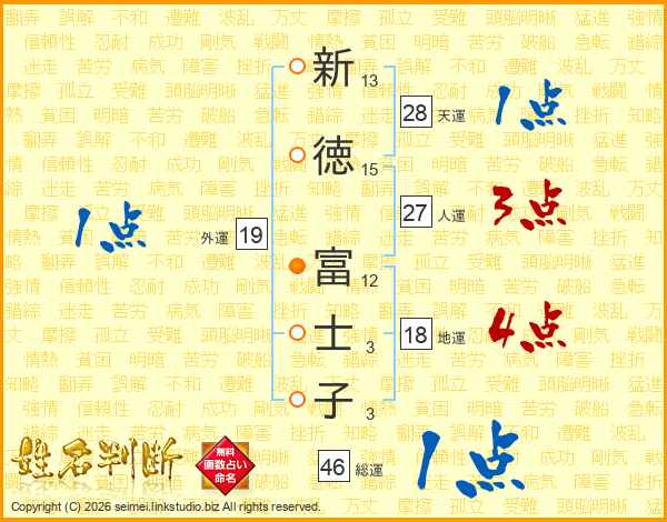 新(13画)徳(15画) 富(12画)士(3画)子(3画)