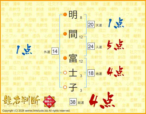 明(8画)間(12画) 富(12画)士(3画)子(3画)