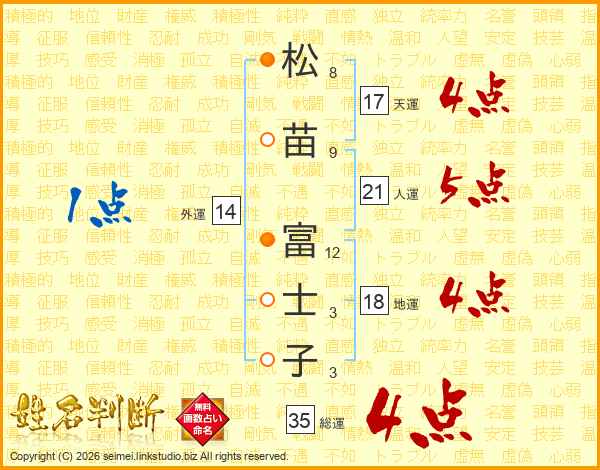 松(8画)苗(9画) 富(12画)士(3画)子(3画)