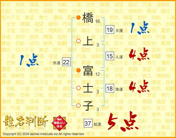 橋(16画)上(3画) 富(12画)士(3画)子(3画)