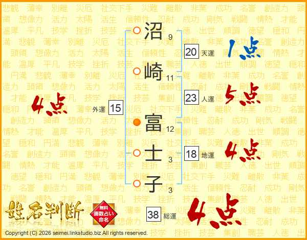 沼(9画)崎(11画) 富(12画)士(3画)子(3画)