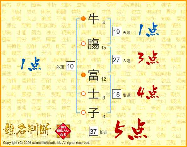 牛(4画)膓(15画) 富(12画)士(3画)子(3画)