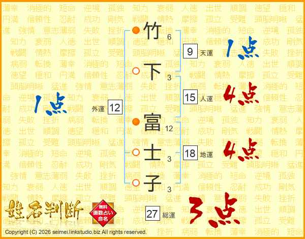 竹(6画)下(3画) 富(12画)士(3画)子(3画)