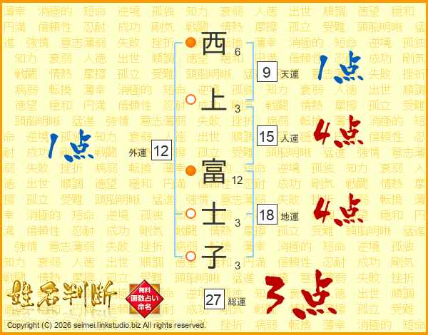 西(6画)上(3画) 富(12画)士(3画)子(3画)