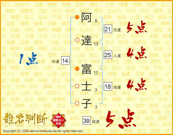 阿(8画)達(13画) 富(12画)士(3画)子(3画)