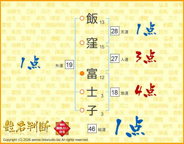 飯(13画)窪(15画) 富(12画)士(3画)子(3画)