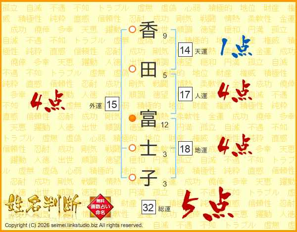 香(9画)田(5画) 富(12画)士(3画)子(3画)