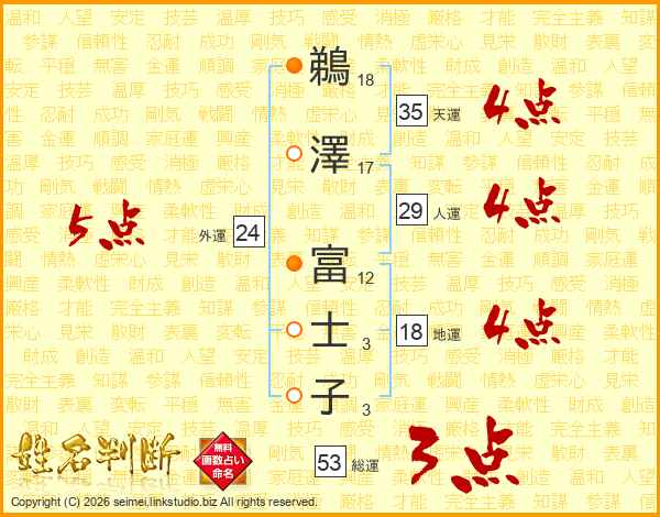 鵜(18画)澤(17画) 富(12画)士(3画)子(3画)