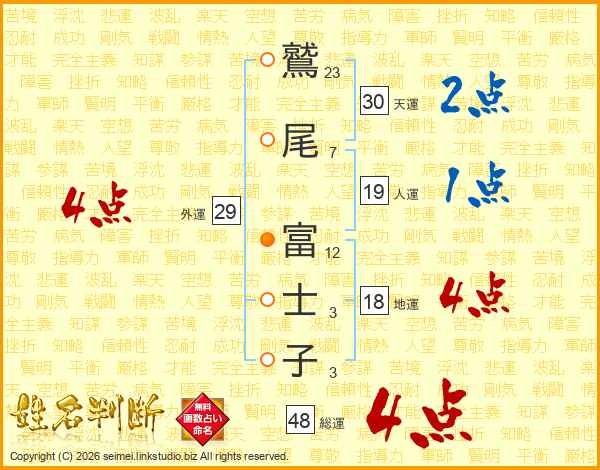 鷲(23画)尾(7画) 富(12画)士(3画)子(3画)