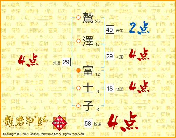 鷲(23画)澤(17画) 富(12画)士(3画)子(3画)