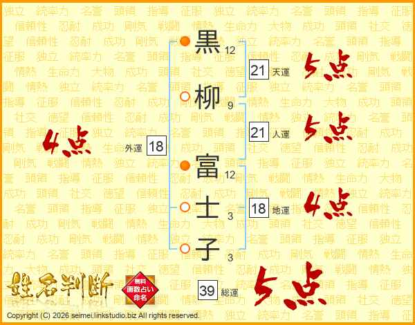 黒(12画)柳(9画) 富(12画)士(3画)子(3画)