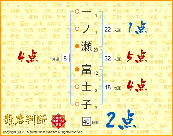 一(1画)ノ(1画)瀬(20画) 富(12画)士(3画)子(3画)
