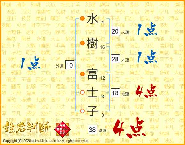 水(4画)樹(16画) 富(12画)士(3画)子(3画)