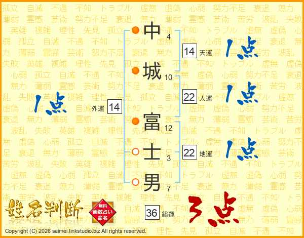 中(4画)城(10画) 富(12画)士(3画)男(7画)