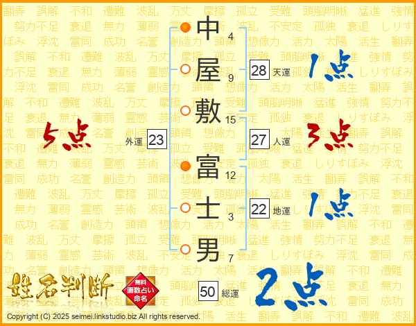 中(4画)屋(9画)敷(15画) 富(12画)士(3画)男(7画)