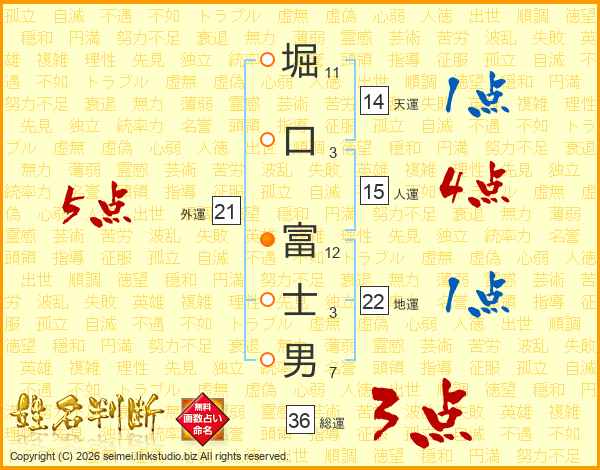 堀(11画)口(3画) 富(12画)士(3画)男(7画)