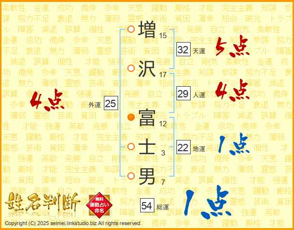 増(15画)沢(17画) 富(12画)士(3画)男(7画)