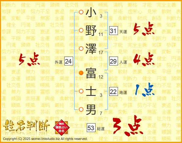 小(3画)野(11画)澤(17画) 富(12画)士(3画)男(7画)