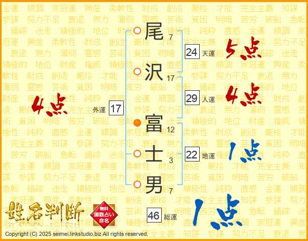 尾(7画)沢(17画) 富(12画)士(3画)男(7画)