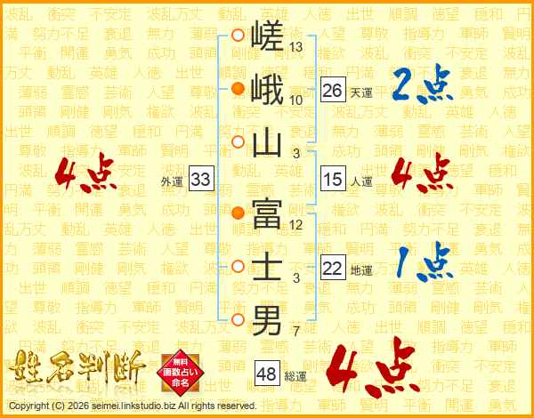 嵯(13画)峨(10画)山(3画) 富(12画)士(3画)男(7画)