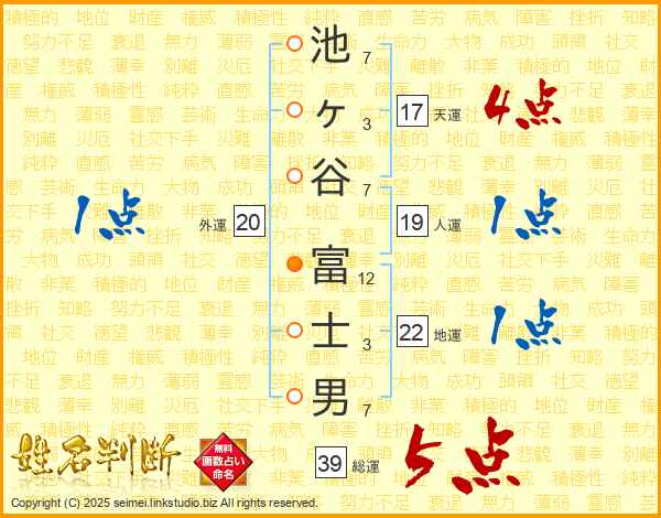 池(7画)ヶ(3画)谷(7画) 富(12画)士(3画)男(7画)