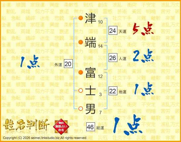 津(10画)端(14画) 富(12画)士(3画)男(7画)