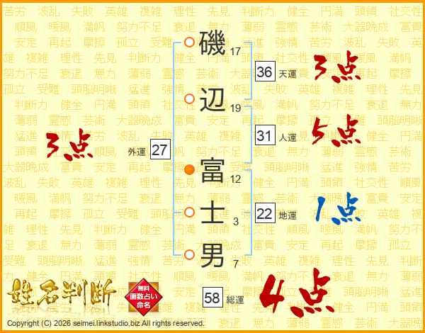 磯(17画)辺(19画) 富(12画)士(3画)男(7画)