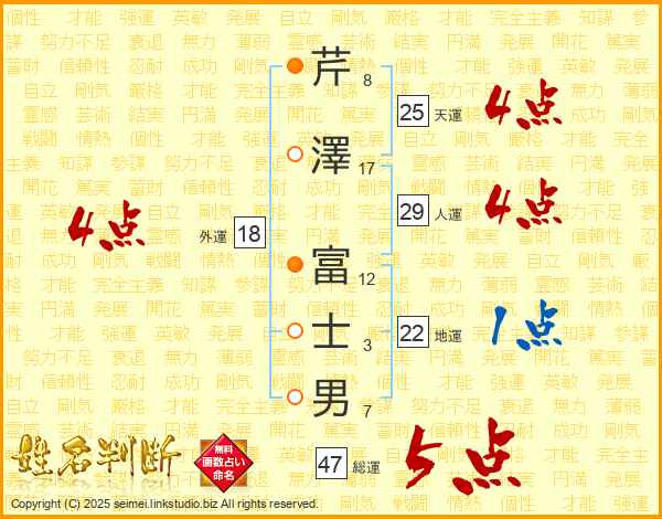 芹(8画)澤(17画) 富(12画)士(3画)男(7画)