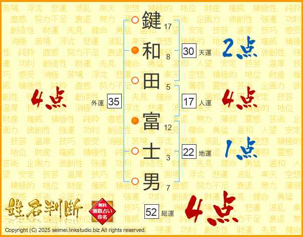 鍵和田富士男さんの総運は52画の4点!