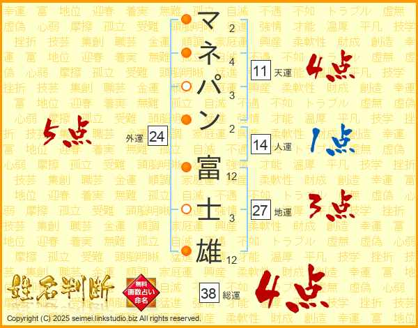 マ(2画)ネ(4画)パ(3画)ン(2画) 富(12画)士(3画)雄(12画)