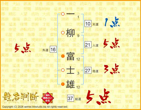 一(1画)柳(9画) 富(12画)士(3画)雄(12画)