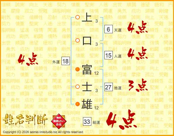 上(3画)口(3画) 富(12画)士(3画)雄(12画)