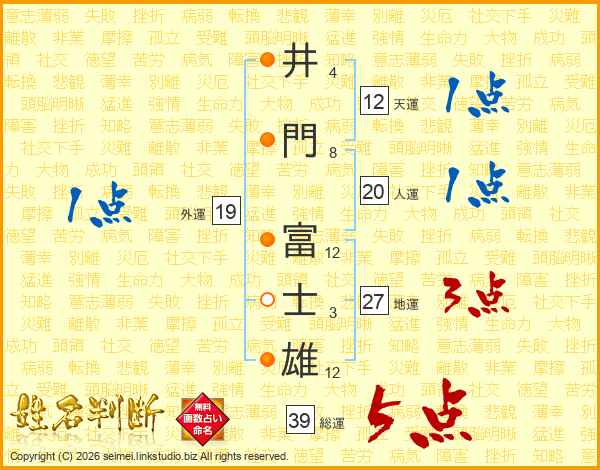 井(4画)門(8画) 富(12画)士(3画)雄(12画)