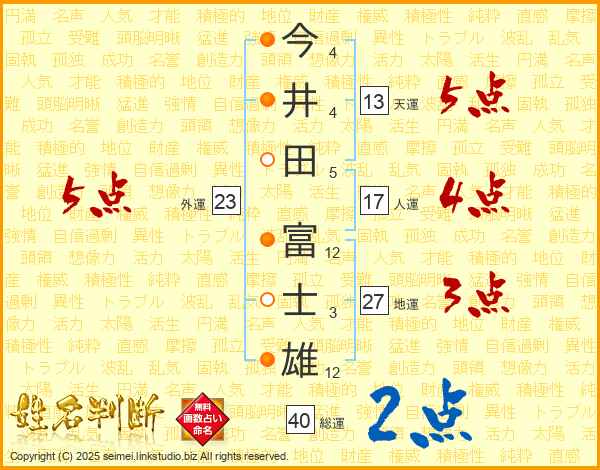 今(4画)井(4画)田(5画) 富(12画)士(3画)雄(12画)