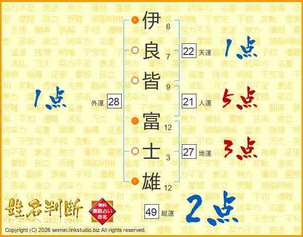 伊(6画)良(7画)皆(9画) 富(12画)士(3画)雄(12画)