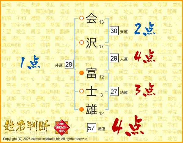会(13画)沢(17画) 富(12画)士(3画)雄(12画)
