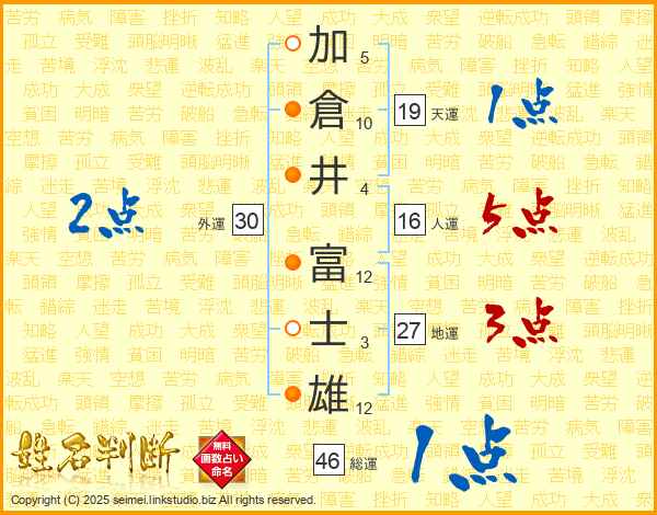 加(5画)倉(10画)井(4画) 富(12画)士(3画)雄(12画)