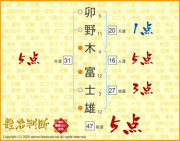 卯(5画)野(11画)木(4画) 富(12画)士(3画)雄(12画)
