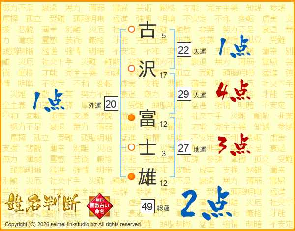 古(5画)沢(17画) 富(12画)士(3画)雄(12画)