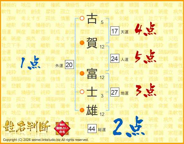 古(5画)賀(12画) 富(12画)士(3画)雄(12画)