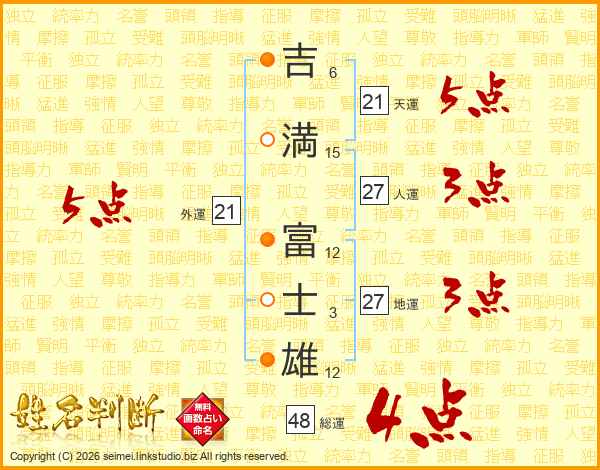 吉(6画)満(15画) 富(12画)士(3画)雄(12画)