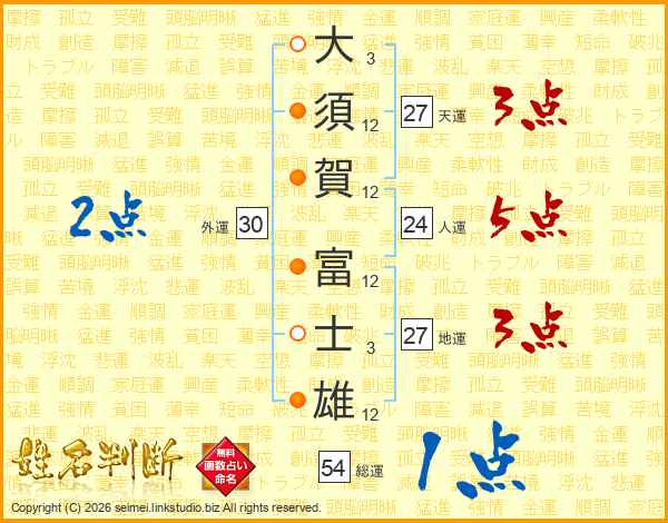大(3画)須(12画)賀(12画) 富(12画)士(3画)雄(12画)